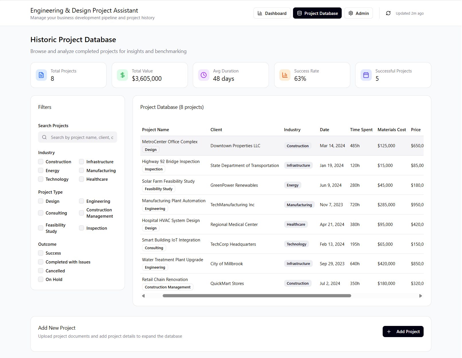 Qualify, price, and draft proposals in one place. The Proposal Agent uses your past projects to predict feasibility and estimate price ranges. Generates proposal using your templates. Perfect for product development and engineering design firms that want to respond faster without pulling engineers off work.